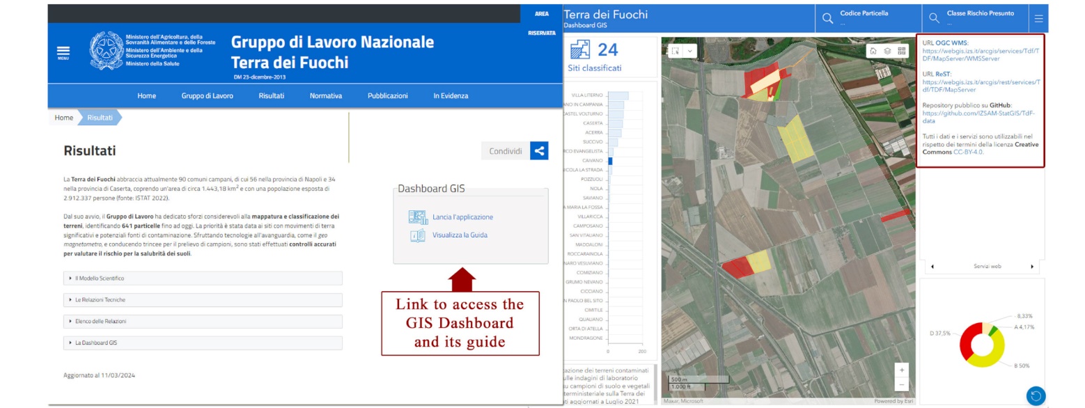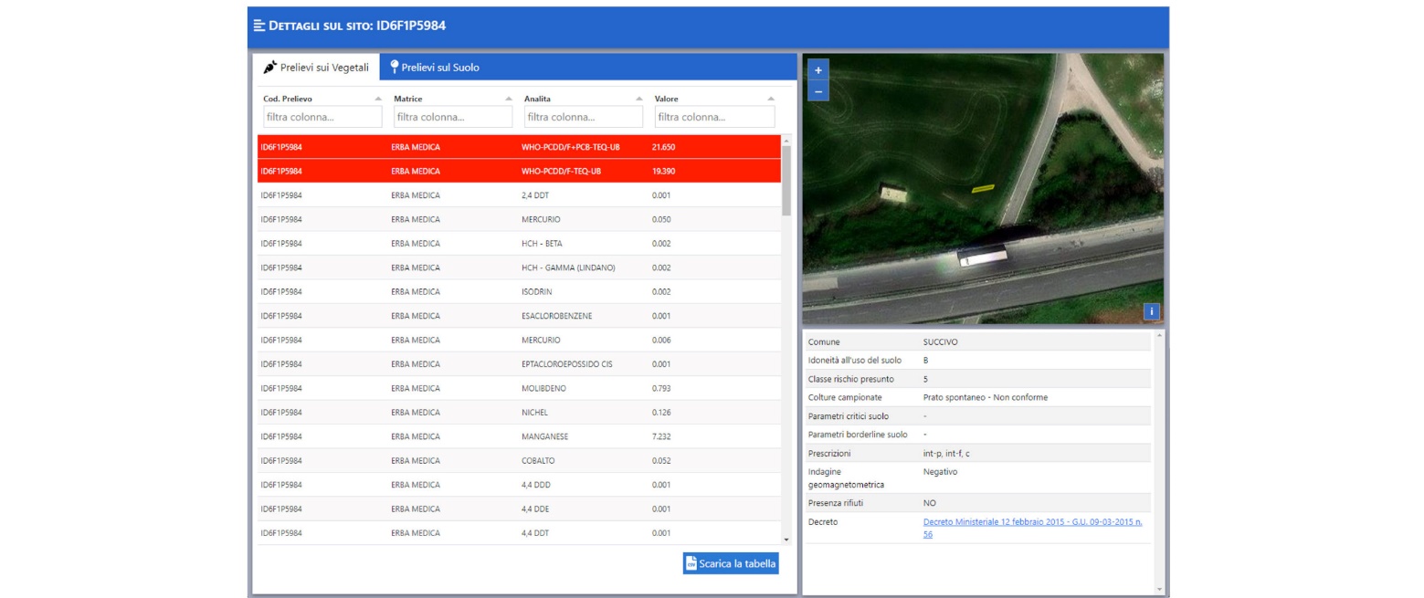 - a tab panel on the right side, featuring tabs reporting the cadastral parcel’s interactive list, the map legend, the notes explaining the prescriptions and criticalities of the contamination, and the URLs of the WMS and REST web services made available;