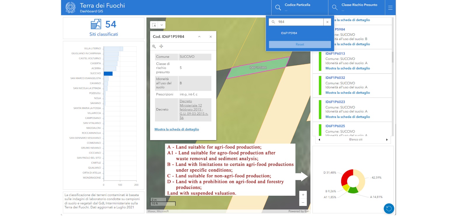 Users have access to informative content about the Land of Fires through menu items such as ‘Home’, ‘Working Group’, ‘Results’, ‘Regulations’, ‘Publications’, and ‘In Evidence’. Additionally, a dedicated ‘GIS Dashboard’ item, reachable from the ‘Home’ menu and the ‘Results’ menu, enables access to a ‘GIS Dashboard’ for visualizing and querying data sets shared by the web services. The ‘GIS Dashboard’ provides the users with a strictly selected set of tools designed to navigate and query the underlying spatial database (Di Lorenzo et al. 2016, Di Lorenzo et al. 2023) through an interactive map, featuring filters and interactive charts (that also function as filters) that summarize information about the cadastral parcels, their distribution, and classification. These tools are seamlessly integrated, providing the user with a cohesive and accessible environment, enabling the public and professionals to fully utilize the system to increase awareness thanks to its ease of use nature. Additionally, the ‘GIS Dashboard’ enables access to analytic results for crop and soil samplings by clicking on the “show the detail sheet” link provided for each cadastral parcel (on the map, in the popup window, or in the list on the right side of the Dashboard user interface). This action launches the ‘Details Viewer’ application, a custom-built module, developed through JavaScript open-source libraries. This module uses the unique cadastral parcel code as a parameter to retrieve the corresponding analysis results from the database. The ‘GIS Dashboard’ features a clean and user-friendly interface, making it accessible even for non-technical users. At the heart of the application, the interactive map displays the administrative boundaries of the surveyed municipalities and the cadastral parcels, color-coded according to permitted agricultural use. In addition to the interactive map, the ‘GIS Dashboard’ includes various interactive widgets organized in different sections: