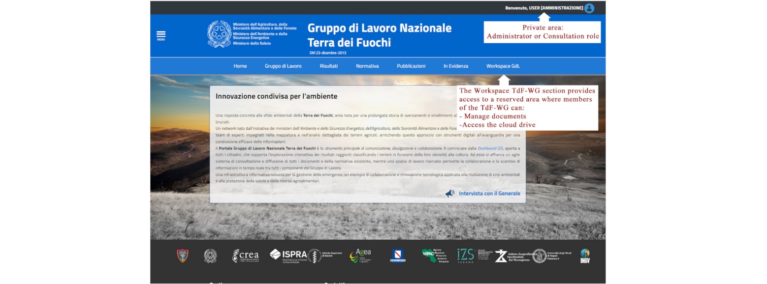 The WG TdF Platform serves as the central hub for accessing and sharing data and outcomes from TdF-WG activities, offering a wide array of content, applications and services to users. Accessible at https://terradeifuochi.izs.it, the portal features both public and private areas. The distinction lies in the inclusion of an additional menu item, ’Workspace GdL’, which is reserved for authorized users to facilitate collaborative work within the TdF-WG (Figure 4).
