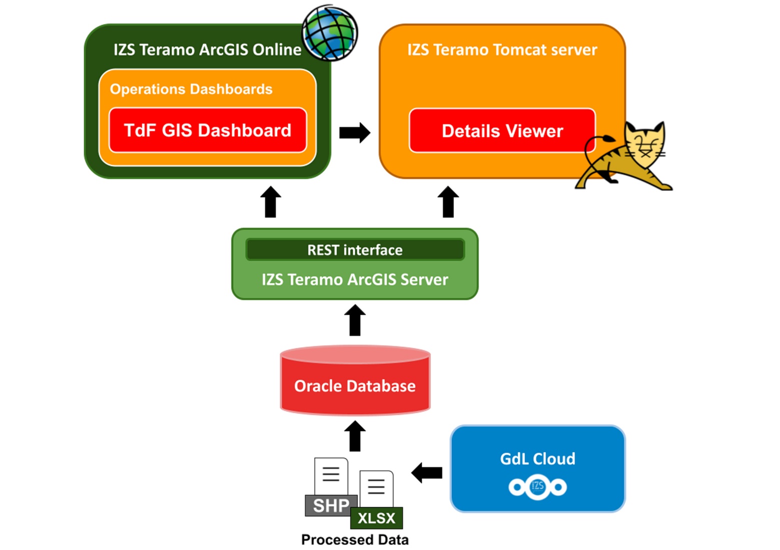 The data were formatted as ESRI shapefiles and Excel spreadsheets, then processed and normalized to fit the database structure (Figure 1). This ensures compatibility and usability with applications and services offered by the WG TdF Platform, like the ’GIS Dashboard’ and the OGC WMS (https://www.ogc.org/standard/wms/) and REST standard web geoservices (http://geoservices.github.io/). Moreover, the entire data set has been made accessible under a Creative Commons license (CC-BY-4.0, https://creativecommons.org/licenses/by/4.0/) in a dedicated GitHub repository (https://github.com/IZSAM-StatGIS/TdF-data) in a dedicated GitHub repository (https://github.com/IZSAM-StatGIS/TdF-data), facilitating dissemination and promoting open collaboration. The data are regularly updated and processed in line with the ongoing work of the TdF-WG, ensuring that the information remains current and accurate. Updates are verified and validated by TdF-WG members to maintain the integrity and reliability of the data.