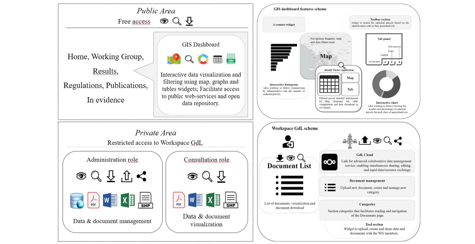WG TdF Platform, accessible at https://terradeifuochi.izs.it, has been developed using Java Server Pages (JSP) for the server side and the Twitter Bootstrap HTML/CSS framework for the user interface. It addresses security aspects and provides an interface for user authorization, enabling access to private content. Figure 2 depicts the conceptual map of the WG TdF Platform, illustrating its two main areas and features: