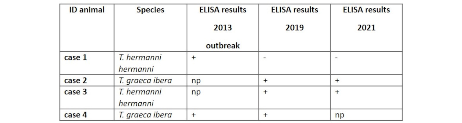 Table. II. Scutavirus testudinidalpha3 serological monitoring of the four Scutavirus testudinidalpha3-infected Mediterranean tortoises from 2013 to 2021. np: not performed.