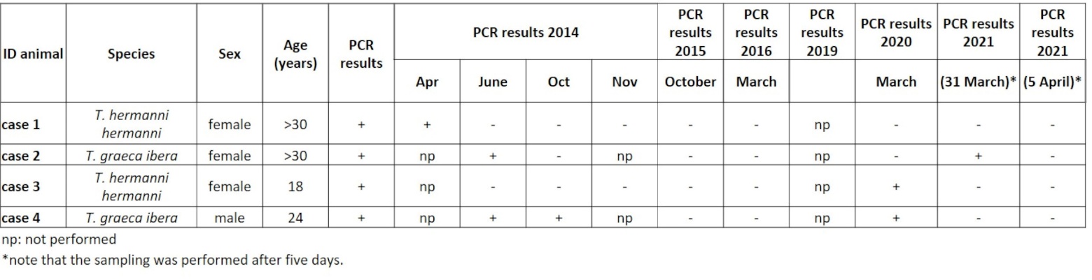 Table. I. Scutavirus testudinidalpha3 PCR monitoring of the four Scutavirus testudinidalpha 3-infected Mediterranean tortoises from 2013 to 2021. The results refer to the specific semi-nested PCR from oral swabs of the animals.