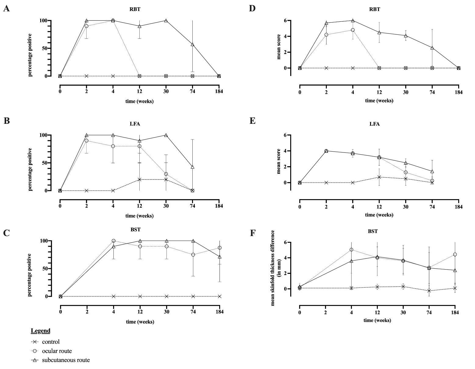 Lastly, the cellular response measured by the BST is also rapid as it happened within 4 weeks PV in all vaccinated animals and persistent, lasting at least until the end of the experiment: five out of seven SHO that received the subcutaneous form and seven out of eight that received the ocular form were still positive to the BST 184 weeks PV (3 ½ years).
