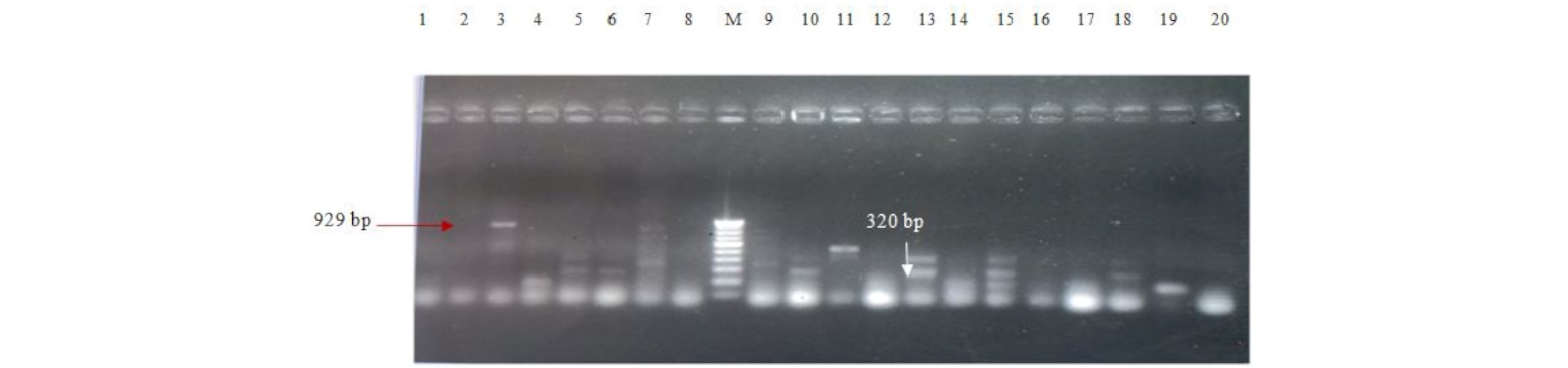 Figure. 6. Multiplex PCR for detection of mcr 1-5 giving bands at 320 bp for mcr-1 and 929 bp for mcr -3.