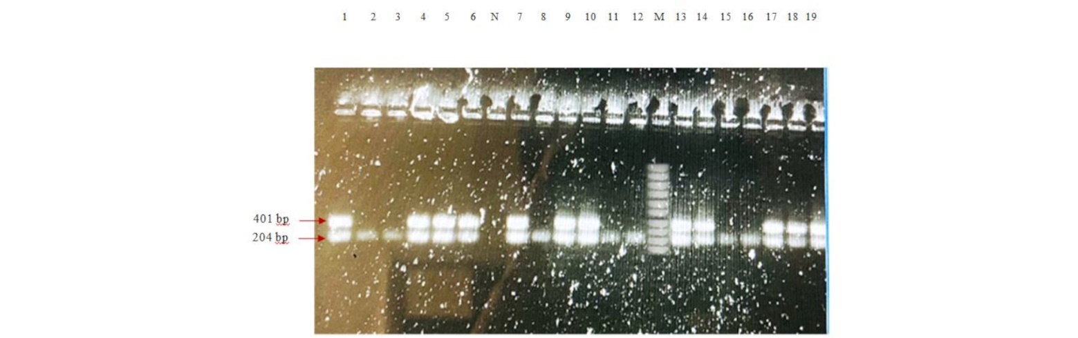Figure. 2. PCR detection of Salmonella genus and serovar Typhimurium; Lane M- Ladder; 1- Positive Control; N-Negative Control; 2-19- Suspected Salmonella genus and serovar Typhimurium.