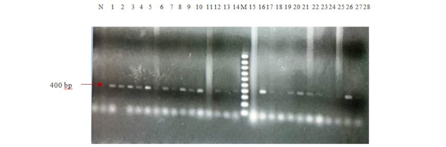 Figure. 3. PCR detection of Campylobacter genus; Lane M- Ladder; N- Negative Control Postive control; 2-28- suspected Campylobacter spp.