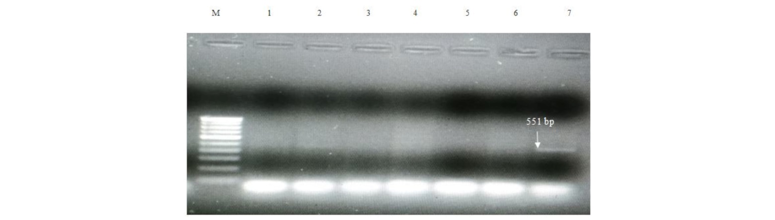 Figure. 7. Multiplex PCR for detection of mcr 6-9 giving bands at 551 bp for mcr-7.