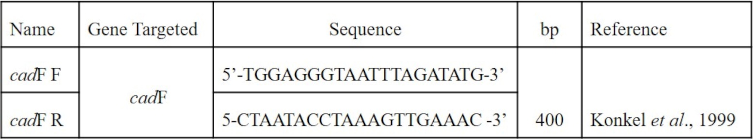 Konkel, M. E., Gray, S. A., Kim, B. J., Garvis, S. G., & Yoon, J. (1999). Identification of the enteropathogens Campylobacter jejuni and Campylobacter coli based on the cadF virulence gene and its product. Journal of clinical microbiology, 37(3), 510–517.