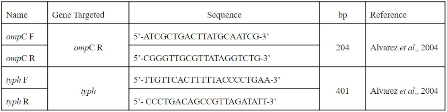 The gene ompC was the target gene for Salmonella genus identification and typh for Typhimurium serotype. The amplification was carried out as follows: Early Denaturation- 95º C 2 min, 30 cycles of- Denaturation at 95 º C 1 min, Annealing at 57º C for 1 min, Extension at 72º C 2 min and finally 1 cycle of Final Extension at 72º C for 5 min.