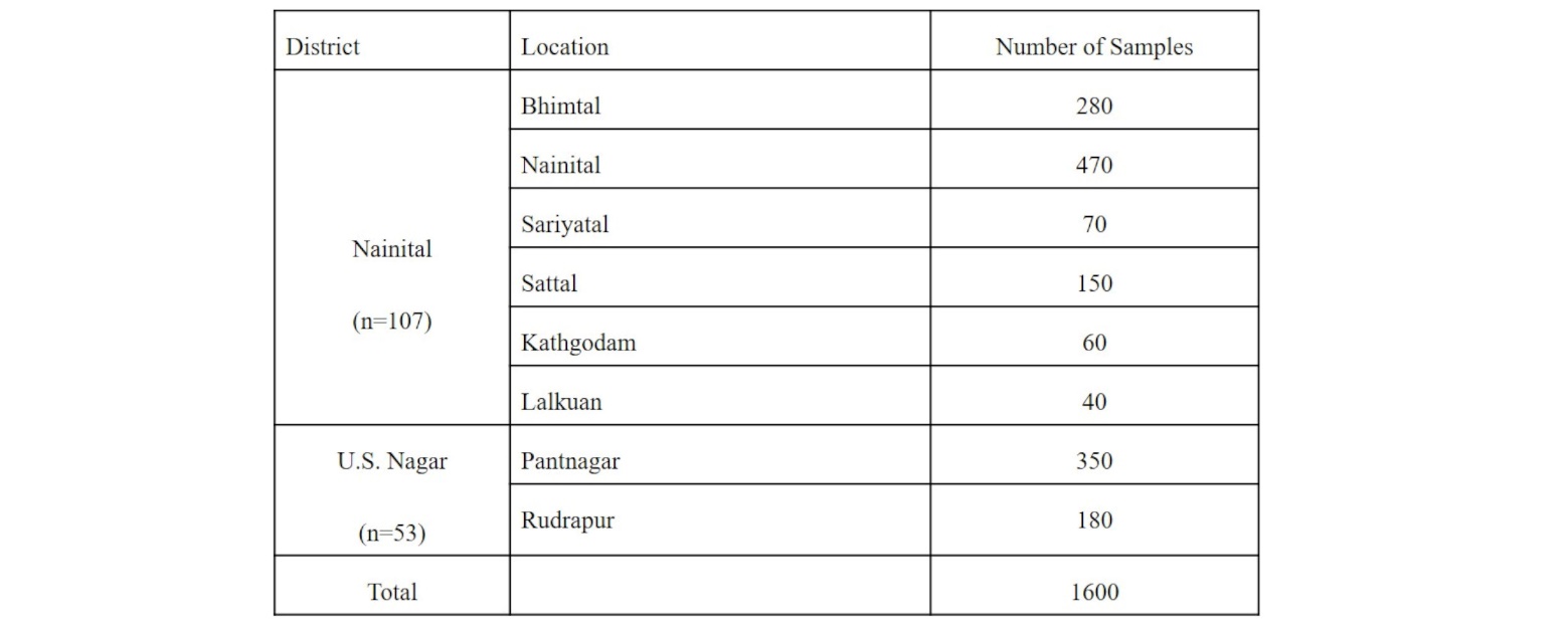 Between April 2022 and March 2023, a total of 1600 water samples were collected from various sources supplying water to residents in different areas of Uttarakhand. The sample collection included Pantnagar (n=350), Rudrapur (n=180), Nainital (n=470), Bhimtal (n=280), Sattal (n=150), Sariyatal (n=70), Kathgodam (n=60), and Lalkuan (n=40). The samples were obtained from lakes (n=870), rivers (n=530), barrage (n=60), industries (n=40), and irrigation pipes (n=100) (Table I).