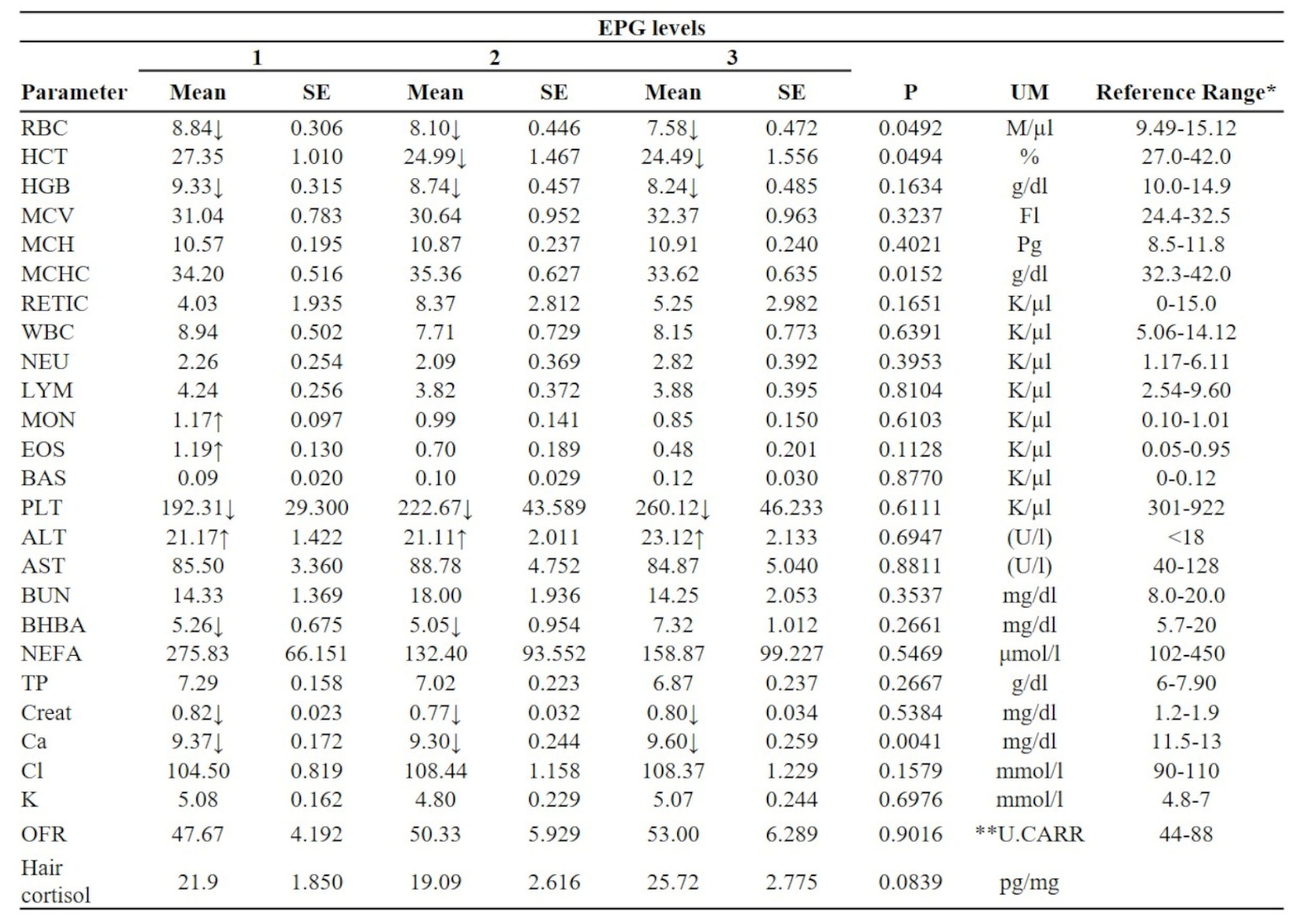 ANOVA test was analysed to check the variability of blood parameters and hair cortisol in relation to EPG levels (level 1 = 0-300; level 2 = 301-600; level 3 = >600 EPG) (Ambrosi, 1995).