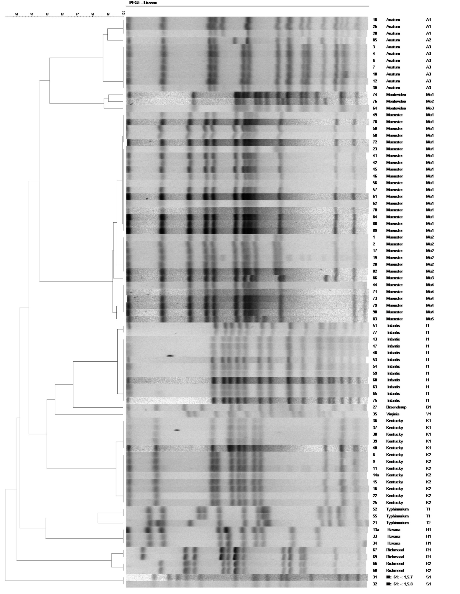 In this study, the PFGE analysis of the 84 Salmonella strains revealed 22 distinct genotypes. Two non-typable strains belonging to serovar S. Muenster were observed, possibly due to DNA degradation during the addition of endonuclease buffer as reported by Turky et al. (2014). The high clonality observed, above 80%, suggests limited genetic variation between the different patterns.