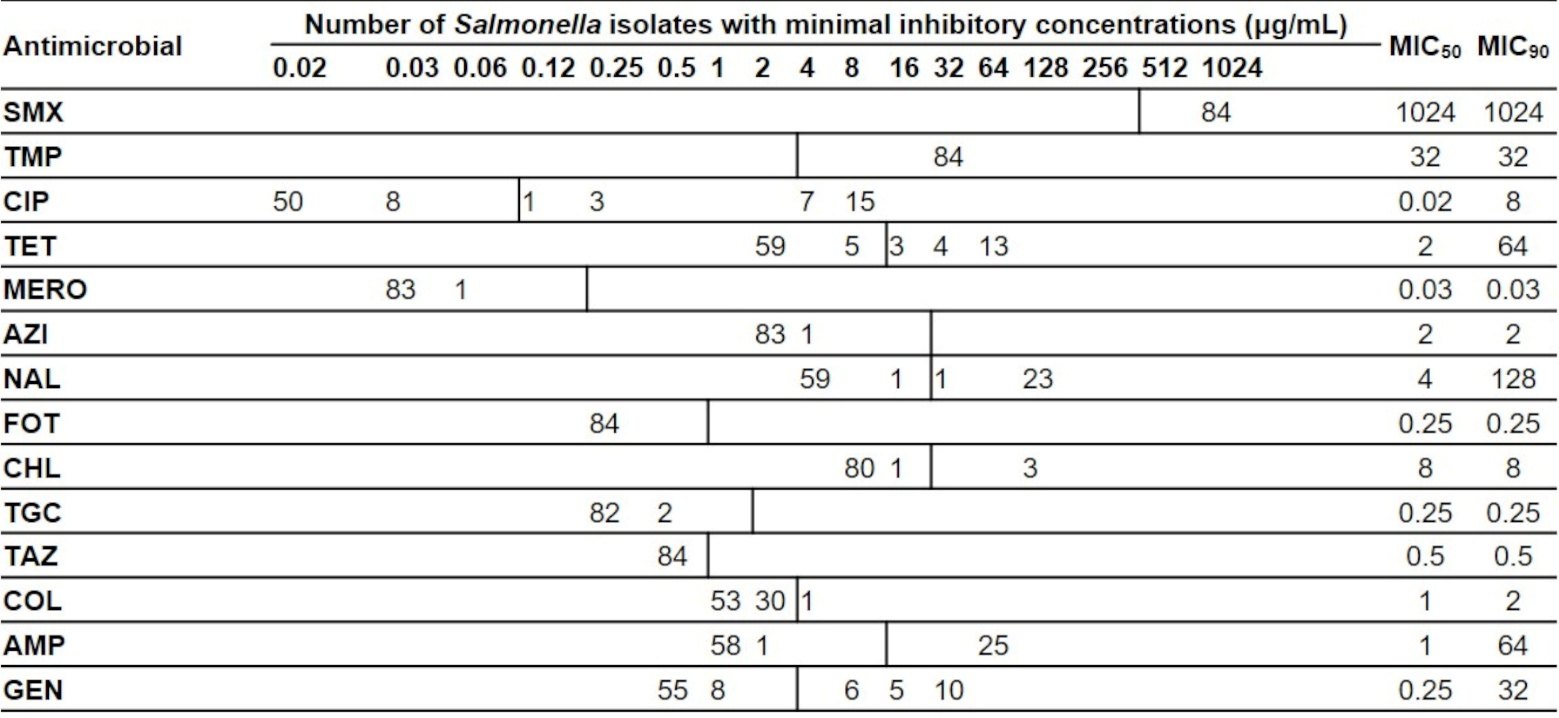 Table. II. Distribution of the minimal inhibitory concentration (MIC) values for the 84 tested Salmonella isolates: SMX: sulfamethoxazole; TMP: trimethoprim; CIP: ciprofloxacin; TET: tetracycline; MERO: meropenem; AZI: azithromycin; NAL: nalidixic acid; FOT: cefotaxime; CHL: chloramphenicol; TGC: tigecycline; TAZ: ceftazidime; COL: colistin; AMP: ampicillin; GEN: gentamicin.