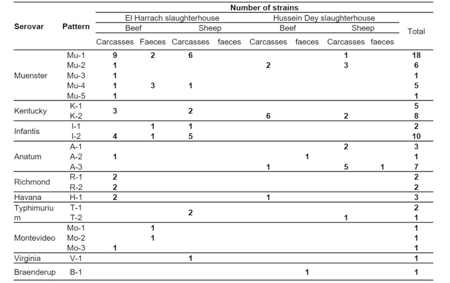 Public awareness about food safety has significantly surged due to the rising number and severity of foodborne illnesses on a global scale. Salmonella is one of the main pathogens responsible for foodborne illnesses. Each year, a total of 93.8 million cases of gastroenteritis caused by Salmonella species worldwide, resulting in 155,000 deaths (Rincón-Gamboa et al., 2021). Salmonella's ability to cause disease is linked to various virulence genes located in its chromosome or large virulence-related plasmids. These genes encode products that facilitate interactions with host organisms during key stages such as colonisation, invasion, intracellular replication, and tissue damage (Nouichi et al., 2023). The primary sources of human Salmonella infections are often linked to contaminated animal-derived food products like meat, poultry, eggs, and dairy products (Fatima et al., 2023). Meat can be contaminated at multiple stages of the supply chain, particularly in abattoirs during evisceration and intestinal content removal, mainly due to cross-contamination from equipment, utensils, and personnel (Cetin et al., 2020; Rincón-Gamboa et al., 2021). In Algeria, various studies have indicated that Salmonella is present in meat products, leading to greater exposure of the population to this pathogenic bacterium (Djeffal et al., 2018; Nouichi et al., 2018; Mezali et al., 2019). This necessitates a thorough investigation into the genetic diversity of these strains.
