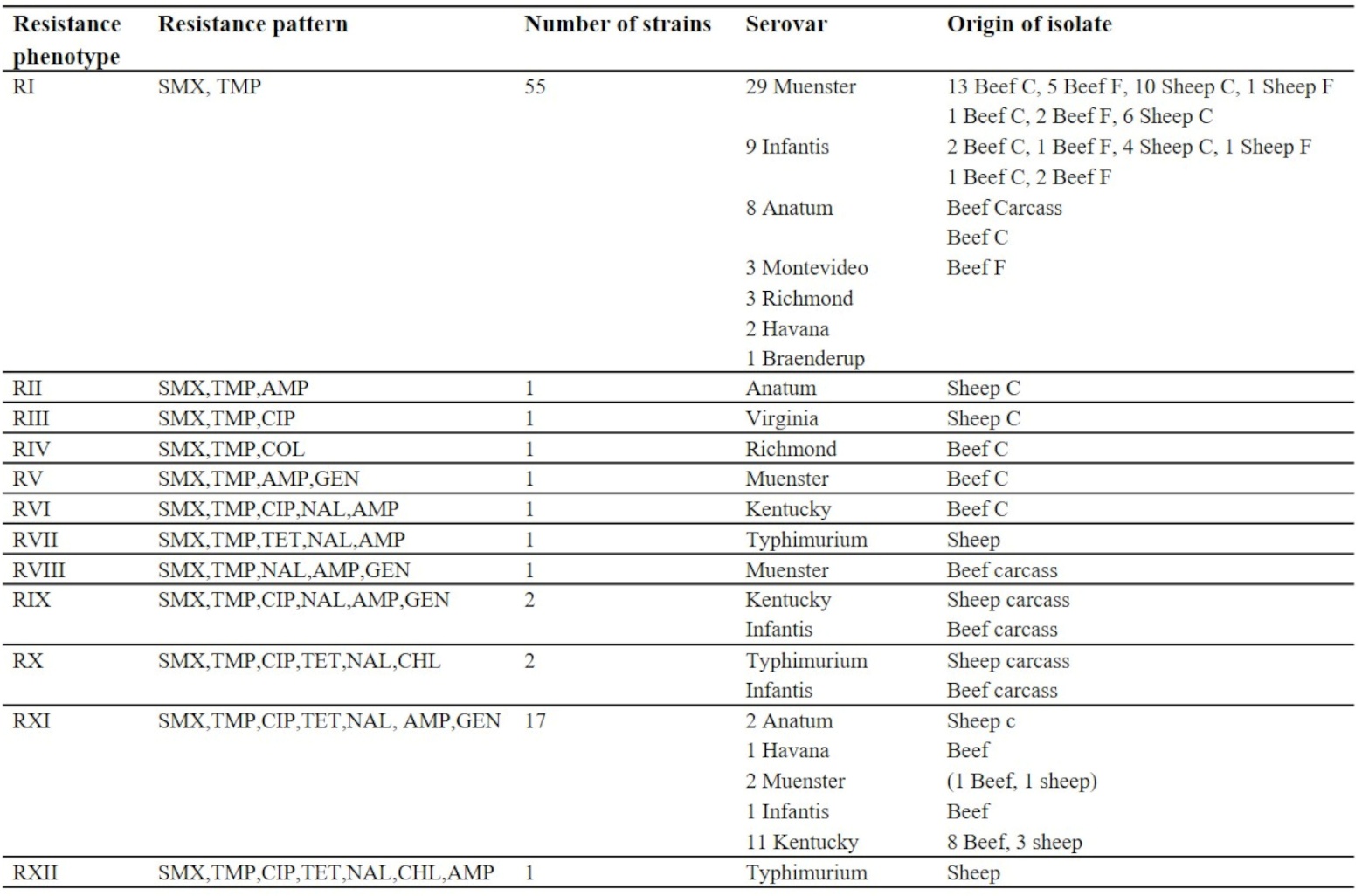 Table. III. Resistance pattern profiles of the studied Salmonella strains: C: carcasses; F: Faeces; SMX: sulfamethoxazole; TMP: trimethoprim; CIP: ciprofloxacin; TET: tetracycline; MERO: meropenem; AZI: azithromycin; NAL: nalidixic acid; FOT: cefotaxime; CHL: chloramphenicol; TGC: tigecycline; TAZ: ceftazidime; COL: colistin; AMP: ampicillin; GEN: gentamicin.