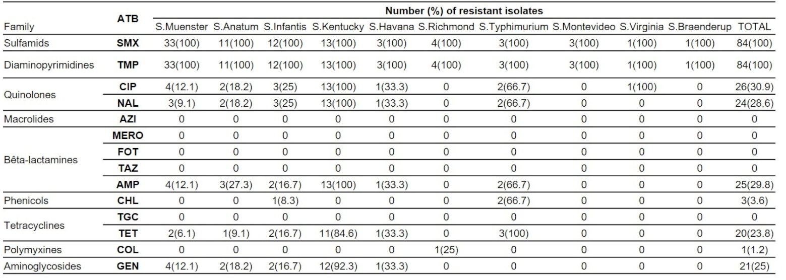 Table. I. Antibiotic resistance rates of Salmonella strains by serovar: SMX: sulfamethoxazole; TMP: trimethoprim; CIP: ciprofloxacin; TET: tetracycline; MERO: meropenem; AZI: azithromycin; NAL: nalidixic acid; FOT: cefotaxime; CHL: chloramphenicol; TGC: tigecycline; TAZ: ceftazidime; COL: colistin; AMP: ampicillin; GEN: gentamicin.