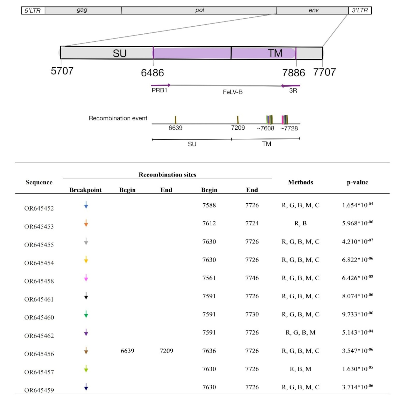 Recombination of endogenous retroviruses and FeLV in infected felines has been shown to contribute to viral evolution and pathogenesis through multiple recombination sites. Recombination events are frequent and affect virulence, transmission, and the ability to evade the immune response. Furthermore, recombination events are associated with changes in the dynamics of infection and disease development (Ngo et al., 2024). The recombination points reported in our study are mainly located in the TM region near ~7608 bp and ~7728 bp, with only one recombination point detected in a sample with a breakpoint in the surface protein (~6639 bp). The recombination points in the TM region have been previously reported by Erbeck et al. (2021) and identified in both FeLV-A and FeLV-end, resulting in the generation of unique FeLV-B genotypes. This genetic recombination generates considerable diversity among FeLV-B subtypes, which is clinically relevant due to the association of FeLV-B with more severe disease manifestations, including a higher incidence of malignancies and immune suppression in infected cats (Erbeck et al., 2021).