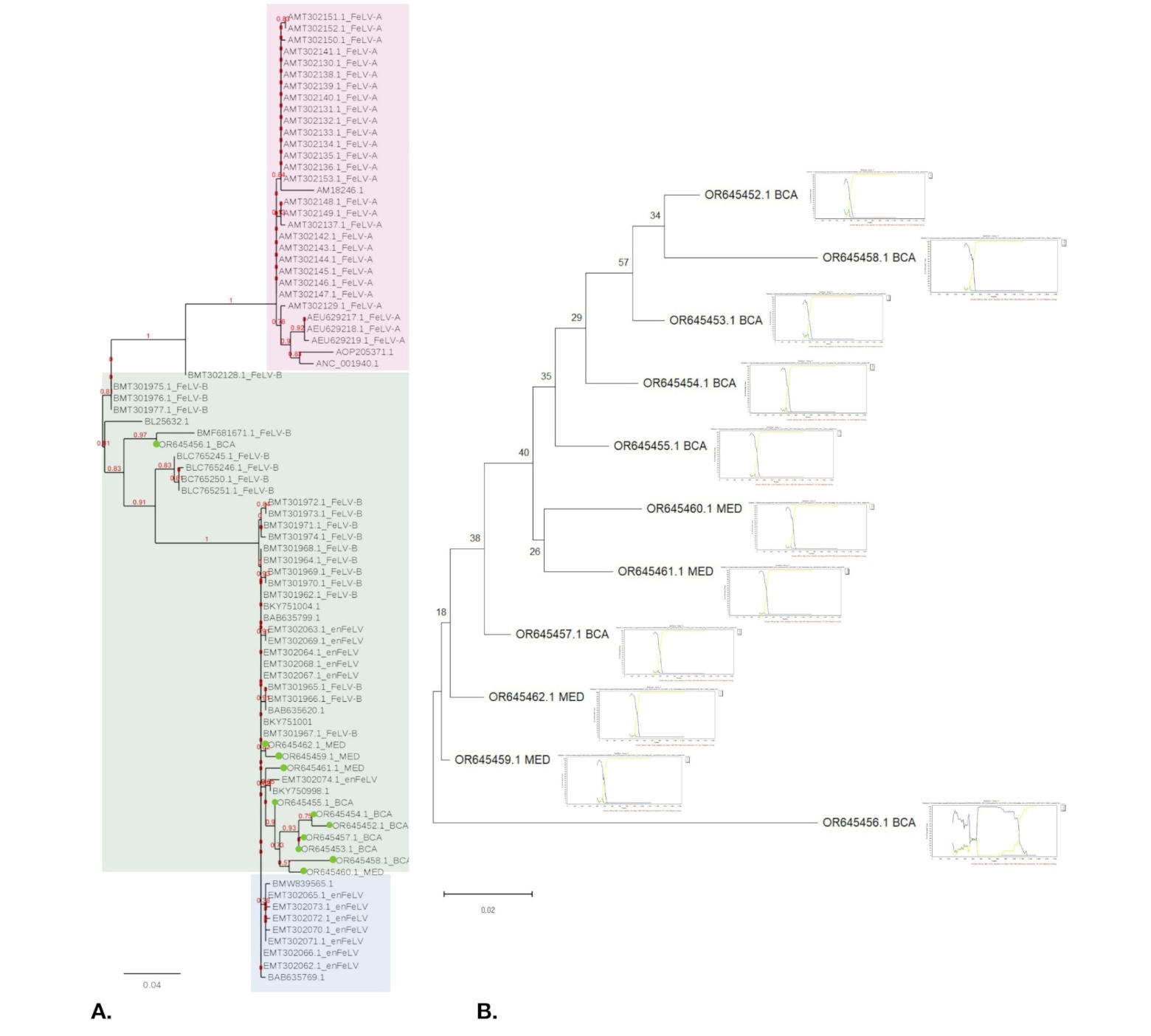 Figure. 2. A. Grouping of FeLV-A, FeLV-B, and FeLV-end based on the analysis of a fragment of the <em>env</em> gene. The phylogenetic tree was constructed using Maximum Likelihood (ML) with 1000 Bootstrap replicates. Pink clade: FeLV-A group. Green clade: FeLV-B group. Green dots: sequences from this study: OR645462, OR645461, OR645460, OR645459, OR645458, OR645457, OR645456, OR645455, OR645454, OR645453, OR645452. B. Clustering of FeLV-B sequences from this study. The phylogenetic analysis was performed using the T92 model. Recombination points for each FeLV-B sequence were generated by Bootscan in Simplot.