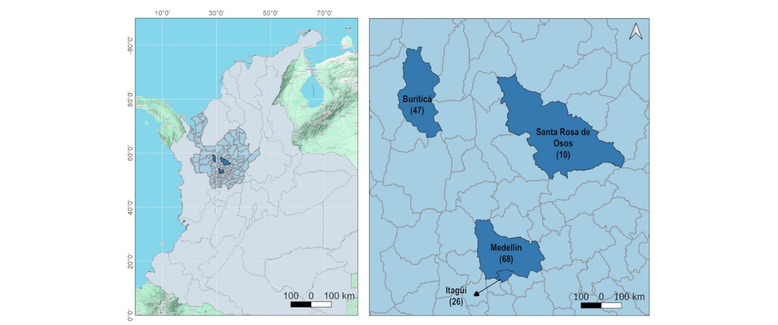 Figure. 1. Geographical location of the sampling sites in the department of Antioquia, Colombia. The number of samples collected from each locality is shown in parentheses: Buriticá (47), Santa Rosa de Osos (10), Medellín (68), and Itagüí (26).