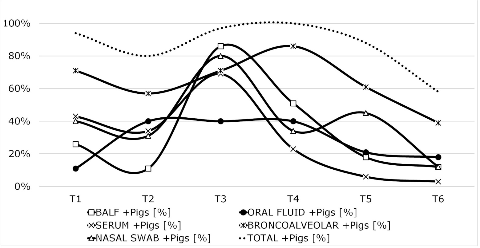 To improve diagnostic performance, the results from two different matrices were evaluated in parallel. By applying this approach, we found that in the first 4 weeks after the pigs' entrance into the fattening unit, the highest sensitivity was achieved by parallel testing of serum and tracheobronchial swabs. This is because the virus was detected in both serum and bronchial swabs in all withdrawals.