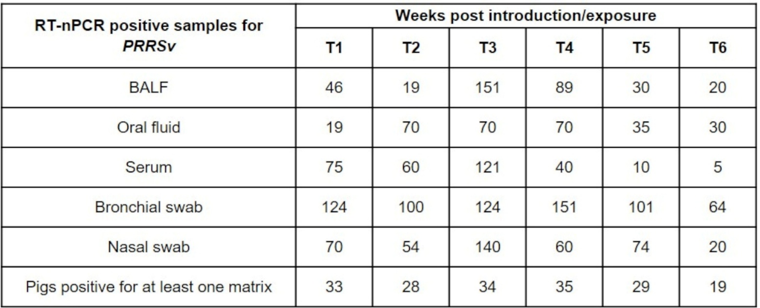 Table. II. Number of RT-nPCR positive samples (BALF, oral fluid, serum, tracheobronchial swab, and nasal swab PRRSv) from pigs sampled at different times after introduction into the fattening pig unit: T1 (35 pigs): 2 weeks after introduction; T2 (35 pigs): 4 weeks after introduction; T3 (35 pigs): 6 weeks after introduction; T4 (35 pigs): 8 weeks after introduction; T5 (33 pigs): 10 weeks after introduction; T6 (33 pigs): 12 weeks after introduction.