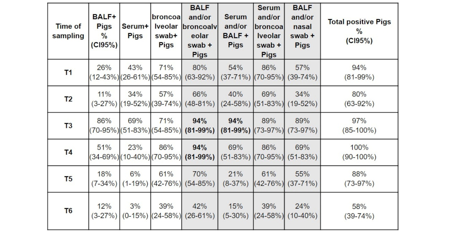 The interpretation of serum and BALF in parallel achieved a sensitivity comparable to the combination of BALF and tracheobronchial swabs only at T3; therefore, the two matrices are well-suited to detect the virus during the acute phase of a PRRS outbreak. This is justified by ongoing viremia combined with the peak sensitivity of BALF, which is the matrix with the highest concentrations of infected alveolar macrophages.