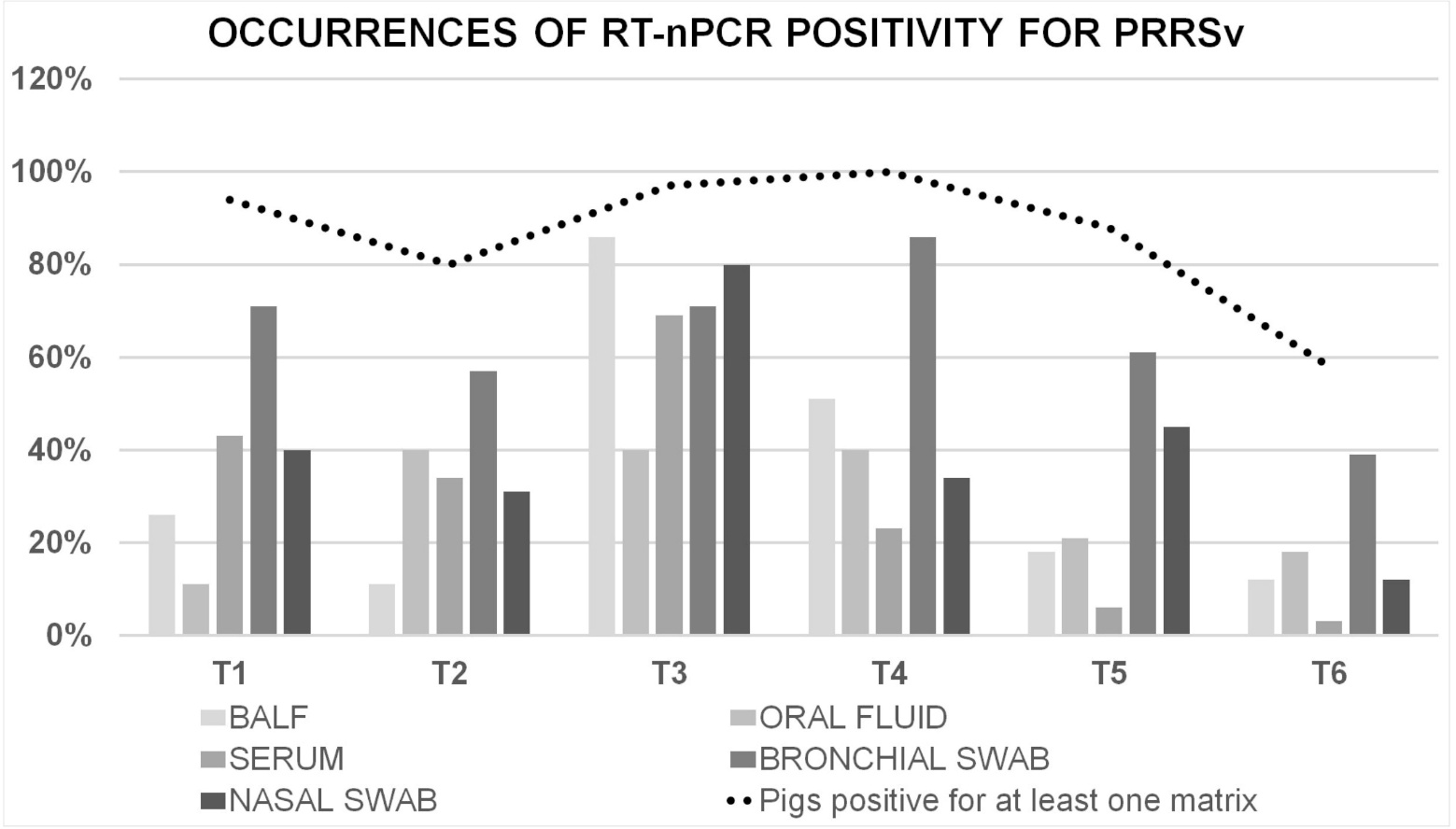 Figure. 1. Percentages of RT-nPCR positive samples (BALF, oral fluid, serum, tracheobronchial swab, and nasal swab for PRRSv) and percentages of pigs positive for at least one matrix.