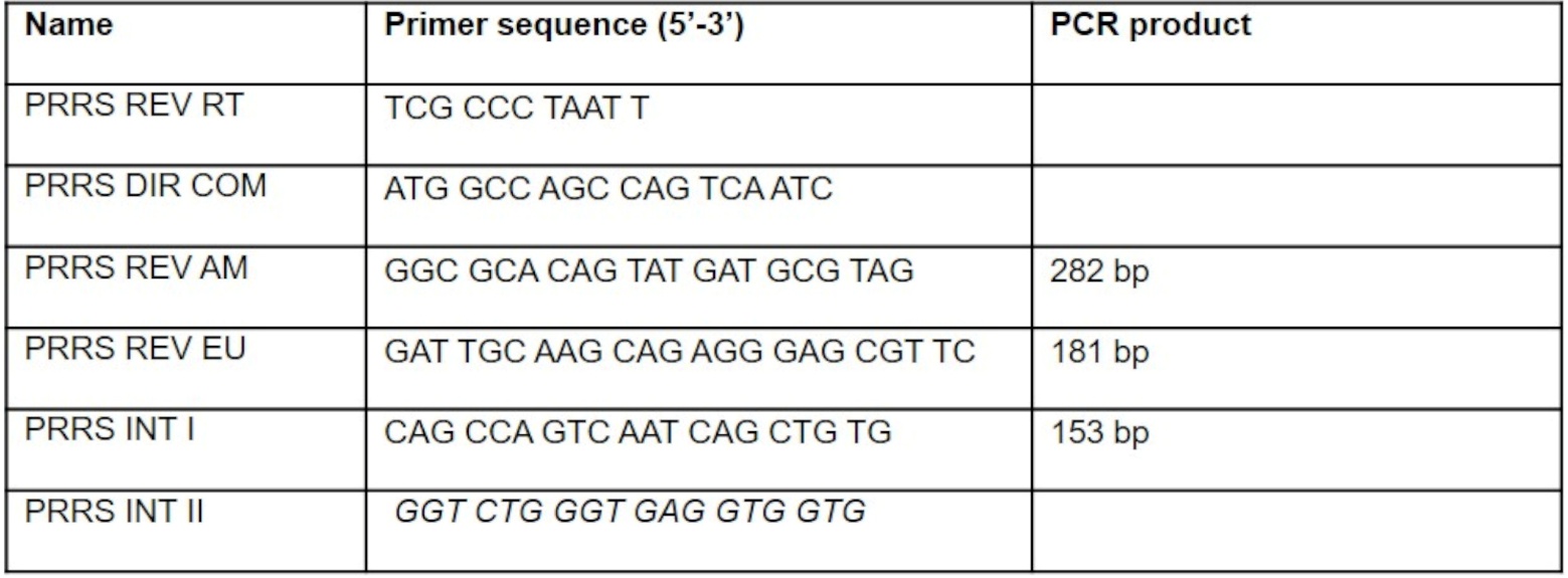 A previously published RT-nPCR assay was selected to assess viral presence in the samples (Persia et al., 2001). This assay uses specific primers targeting the ORF7 sequence at the 3' end of the PRRSv genome for both the European (EU) and North American (NA) strains (Table 1).