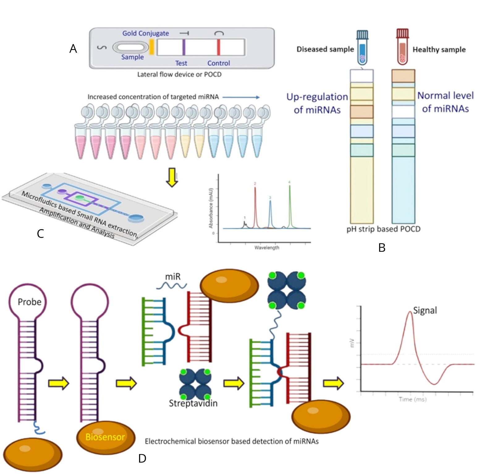Figure. 4. Point on care devices for detection of miRNA. (A) Lateral flow device (B) pH strip based POCD (C) Micropads for extraction and analysis of small RNA (D) Electrochemical.