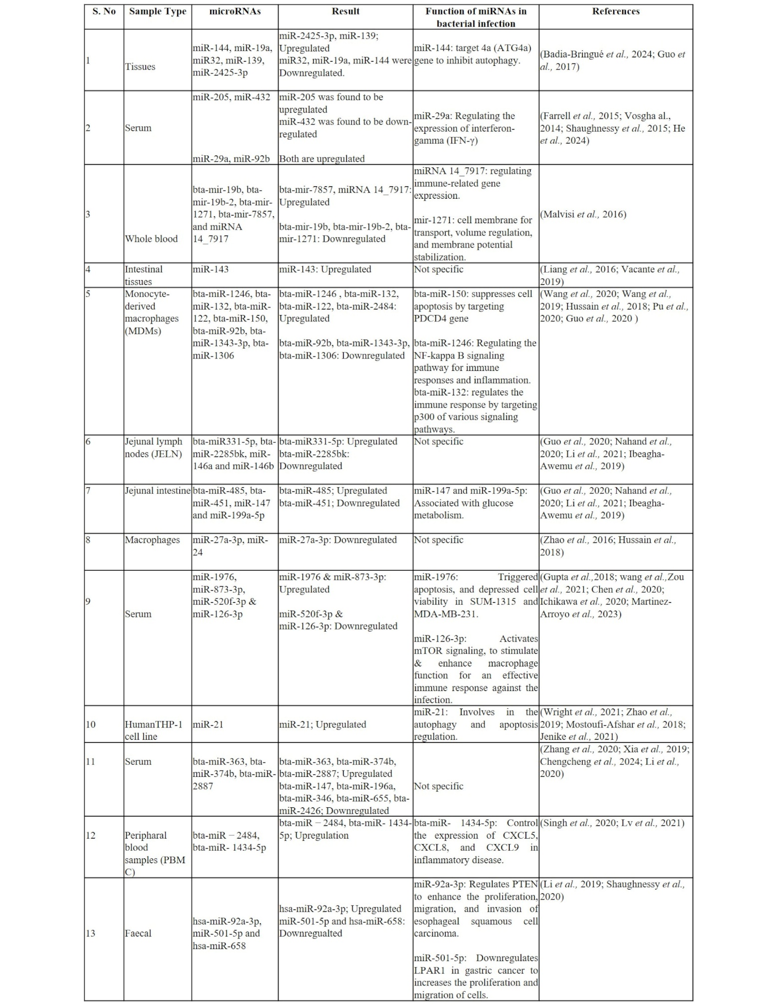| 1 | Modulating inflammatory responses | miRNA-144, miR-32miR-139miR-19amiR-144bta-miR-132bta-miR-2285bk | (Badia-Bringué et al., 2024; Wang et al.,2019) |
