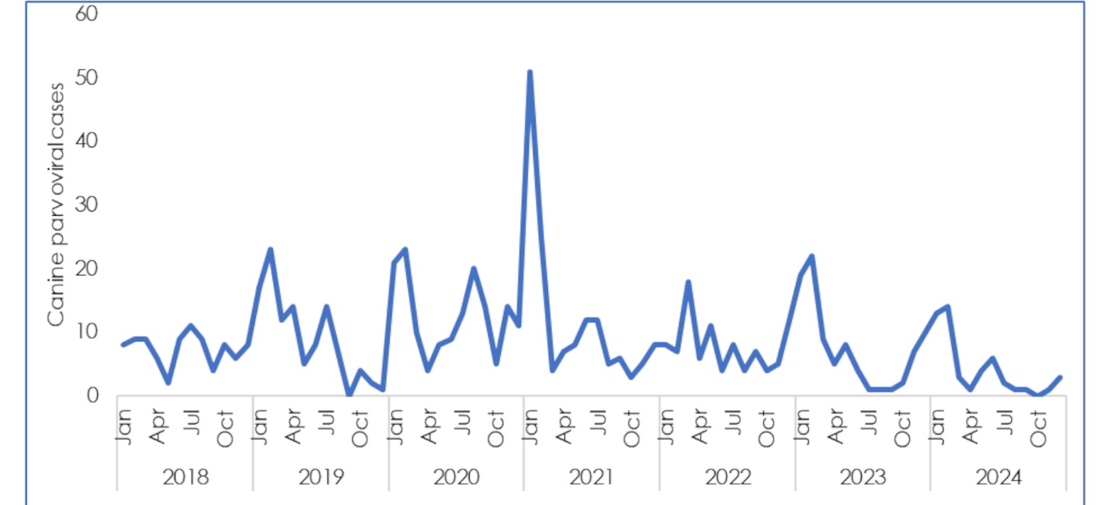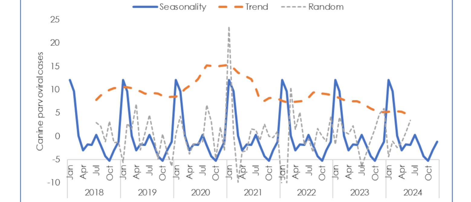 This study provides an in-depth analysis of the temporal patterns of canine parvoviral enteritis (CPE) in Ibadan, Nigeria, from 2018 to 2024, employing classical moving average decomposition and an Autoregressive Integrated Moving Average (ARIMA) model for forecasting future incidence. It builds upon earlier works conducted in Nigeria (Ukwueze et al., 2020; Agada et al., 2022). For instance, Ukwueze et al. (2018) reported a prevalence of confirmed CPE ranging from 31% to 43% among diarrheic dogs in southeastern Nigeria, though their study did not address seasonality. Conversely, Agada et al. (2022) explored seasonal trends in CPE cases in Abuja, north-central Nigeria, from 2011 to 2021, noting peak incidence during the dry season—an observation consistent with our findings. Although this study did not investigate the specific CPV-2 variants responsible for the observed cases, previous molecular studies in Nigeria have identified CPV-2a and CPV-2c as the predominant strains, with CPV-2c being more prevalent (Shima et al., 2020; Ukwueze et al., 2020). Further studies are warranted to explore the seasonal dynamics of CPV-2a and CPV-2c circulation across different ecological zones in the country.