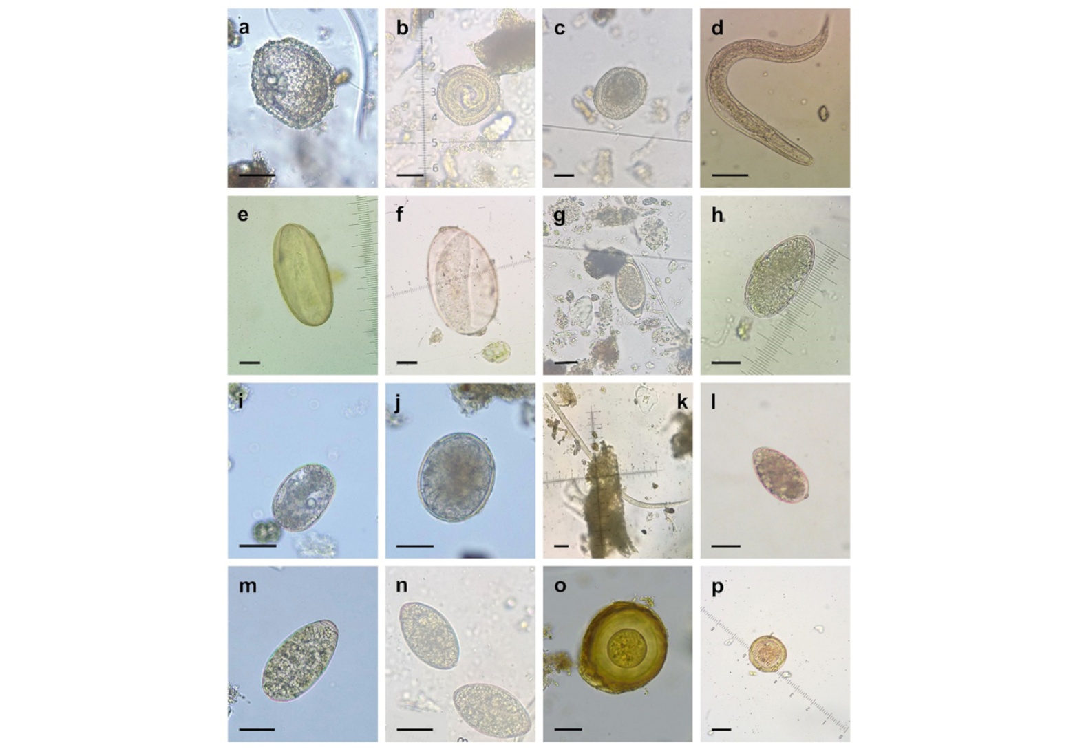 Figure. 2. Morphotypes of helminths eggs 400× detected in fecal samples of small carnivores (Mammalia: Carnivora) from a Tropical Dry Forest in the Colombian Caribbean. (a) Ascaris sp., (b) Ascaridid-Type 1 egg, (c) Toxocara sp., (d) Strongylida-Type larvae, (e) Oxyurid-Type 1 egg, (f) Oxyurid-Type 2 egg, (g) <em>Trichuris </em>sp., (h) Nematode unidentified egg 1, (i) Nematode unidentified egg 2, (j) Nematode unidentified egg 3, (k) Nematode unidentified larvae, (l) Heterophyidae/Plagiorchiidae egg, (m) Trematode egg, (n) <em>Spirometra</em><em> </em>sp., (o) Hymenolepid-Type cyst, (p) Cestode unidentified cyst. Scale bar 25 µm.