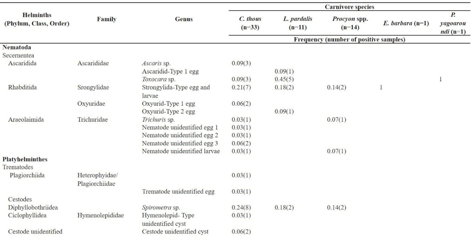 Infection frequencies for C. thous and L. pardalis were lower than those reported in necropsy-based studies (e.g., Ruas et al., 2008; Fiorello et al., 2006), likely reflecting methodological differences, as fecal examination tends to detect fewer parasite taxa than necropsy (Jorge et al., 2013; Miller et al., 2018). For Procyon spp., E. barbara, and P. yagouaroundi, the lack of comparative data limits broader interpretation.