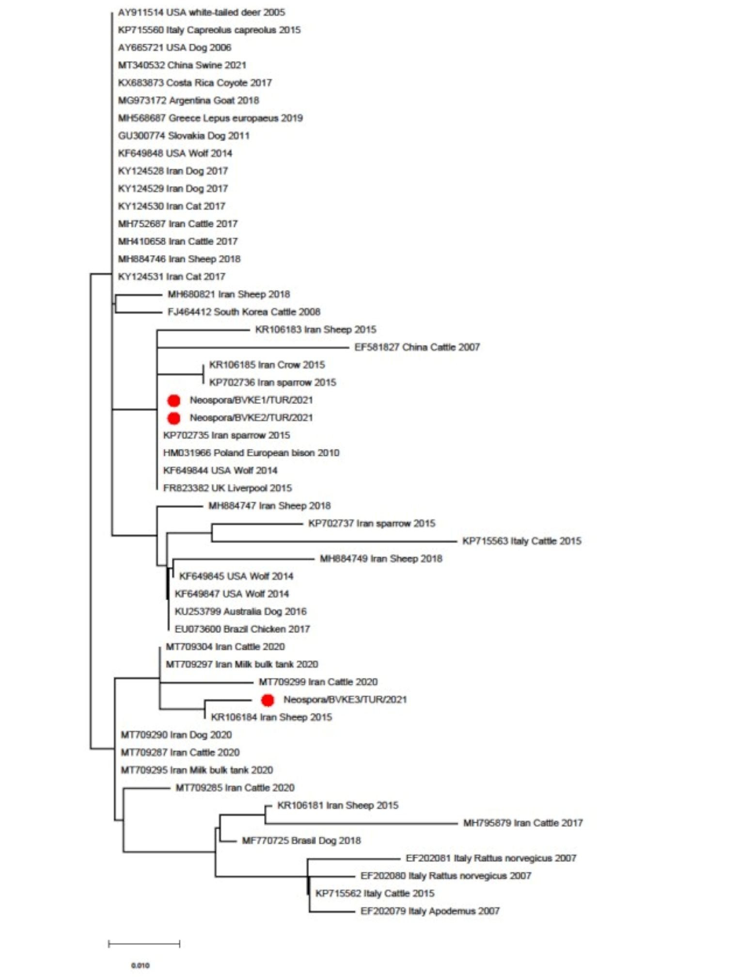 Instead, they shared close genetic similarity with isolates from diverse global regions. Two of the Turkish isolates (Neospora/BVKE1/TUR/2021 and Neospora/BVKE2/TUR/2021) clustered within the same branch, whereas the third (Neospora/BVKE3/TUR/2021) was located in a separate clade. Overall, phylogenetic grouping did not correlate with host species or geographic origin, as isolates from multiple species (e.g., chicken, rat, dog, deer, pig, coyote, rabbit, wolf, sparrow, and cattle) were interspersed throughout the tree.