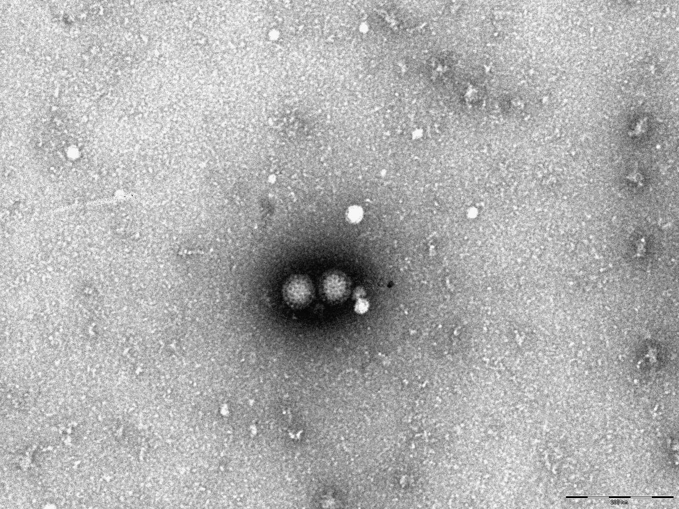 Figure. 6. Transmission electron microscopy (TEM) image of viral particles observed in the supernatant of CEL cell culture following first passage. Specimen prepared by negative staining. The virions display morphological features consistent with avian reovirus.<strong> </strong>Bar = 200 nm