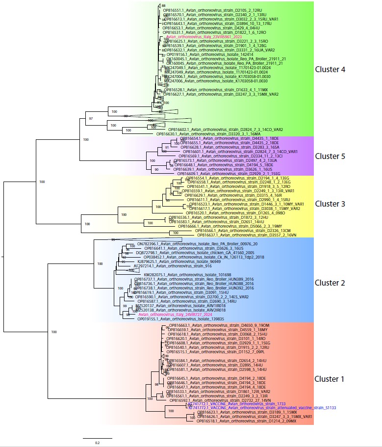Although Stamilla et al., (2021) described an intestinal coinfection reovirus–astrovirus in a farm in 2021, this is the first report of ARV cluster 2 and 4 tenosynovitis in Italy in recent years. The viral clusters involved in the outbreaks differ from cluster 1, used in commercial vaccines, drawing the attention to the need of monitoring the epidemiology of ARV in order to adapt vaccination strategies in the breeders and improve control and prevention of infectious tenosynovitis caused by ARVs. Notably, the σC protein of the two Italian viruses shares only 49.8–57.8 % amino-acid identity with that of the vaccine strain S1133, underscoring substantial divergence in a key antigenic protein that drives the production of neutralising antibodies.