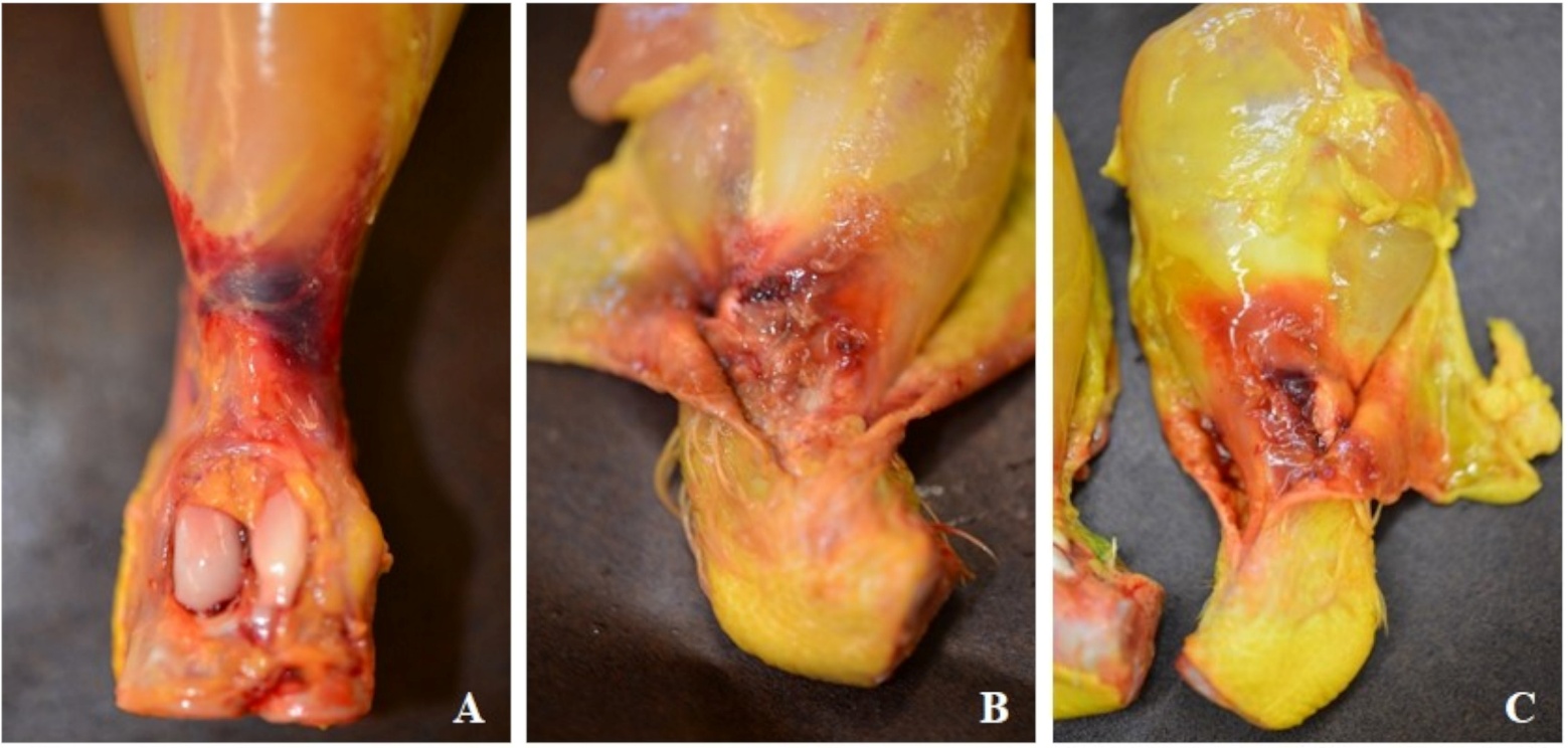 Focal greenish cutaneous hematomas (Figure 4A) and subcutaneous oedema were found in all the shanks. Subcutaneous fibrino-heterophilic exudate and haemorrhages with adhesions between muscle and skin were observed (Figure 4B-C).