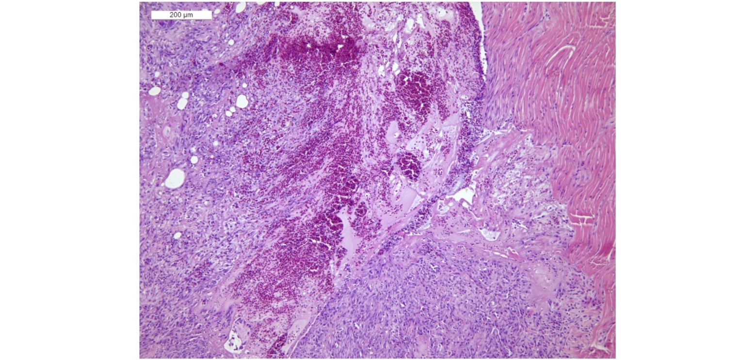 The drumsticks of Case 1 and Case 2 showed severe and diffuse tendon thickening due to fibrosis and lymphoplasmacytic and histiocytic infiltrate. A large fibrino-hemorrhagic area was also detected (Figure 8).