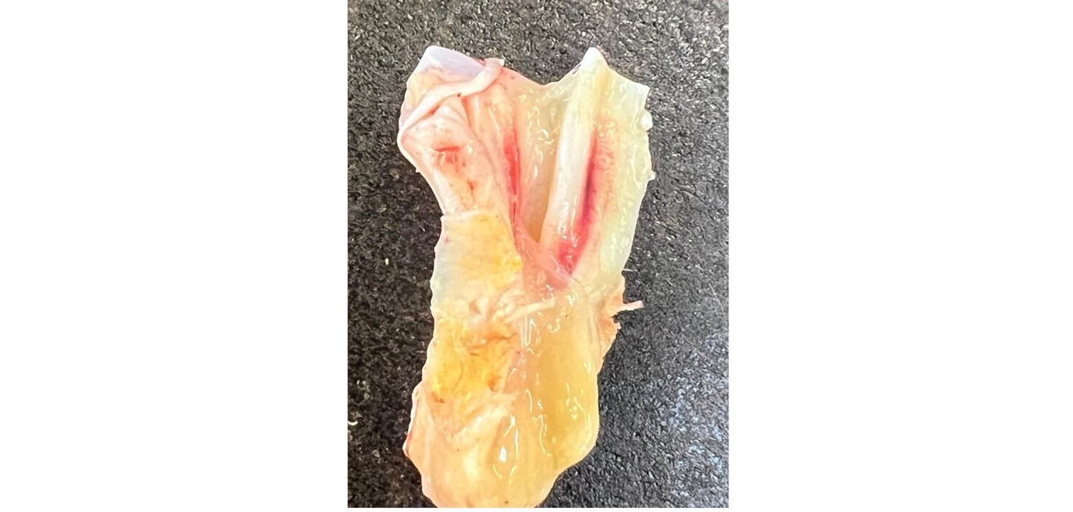 Necrotic cellulitis was highlighted in one drumstick (Figure 5A). Focal haemorrhages were present in the superficial muscles of the thigh, which in some cases infiltrated between the muscle bundles (Figure 5A-C). These haemorrhages were not present in the deep muscles of the thigh near the tibial bone (Figure 5D). The femorotibial synovial sheaths showed haemorrhages and edema along the course of the sheath without apparent involvement of the tendons (Figure 5D), while the patellofemoral joint did not show any pathological exudate.