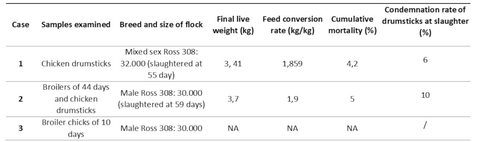 Table. I. Description of cases and production performances in the affected flocks. NA: not available. Reference performances of mixed sex Ross 308/Male Ross 308 [Aviagen 2022 Ross 308 broiler performance objectives available at: https://aviagen.com]: Final live weight (kg): 4,2/4,714 and feed conversion rate (kg/kg) 1,773/1,71.
