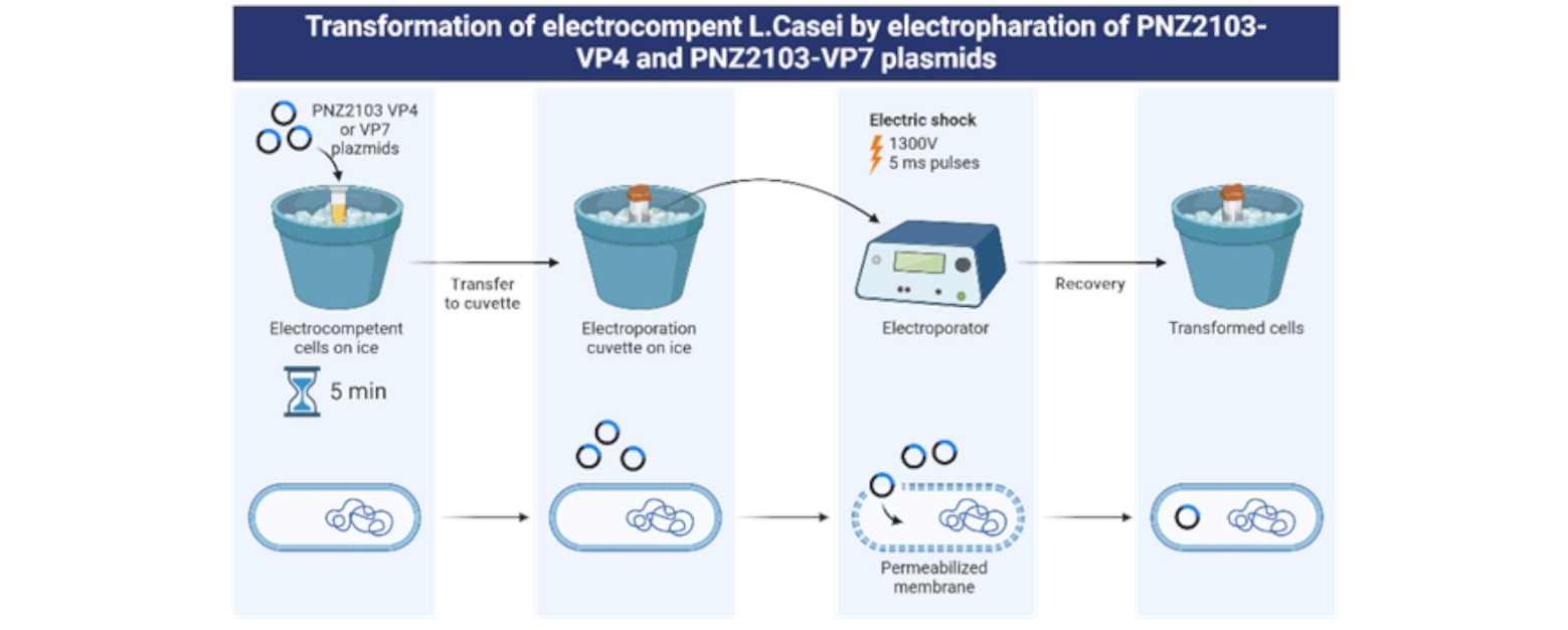 Figure. 3. Transformation of electrocompetent <em>L. casei</em> by electroporation of PNZ2103-VP4 and PNZ2103-VP7 plasmids (via BioRender.com, Toronto, Canada).