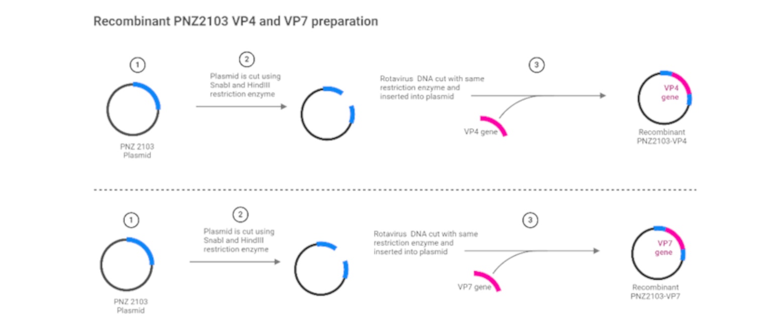 Figure. 1. Recombinant PNZ2103 VP4 and VP7 schematic illustration (via BioRender.com, Toronto, Canada).
