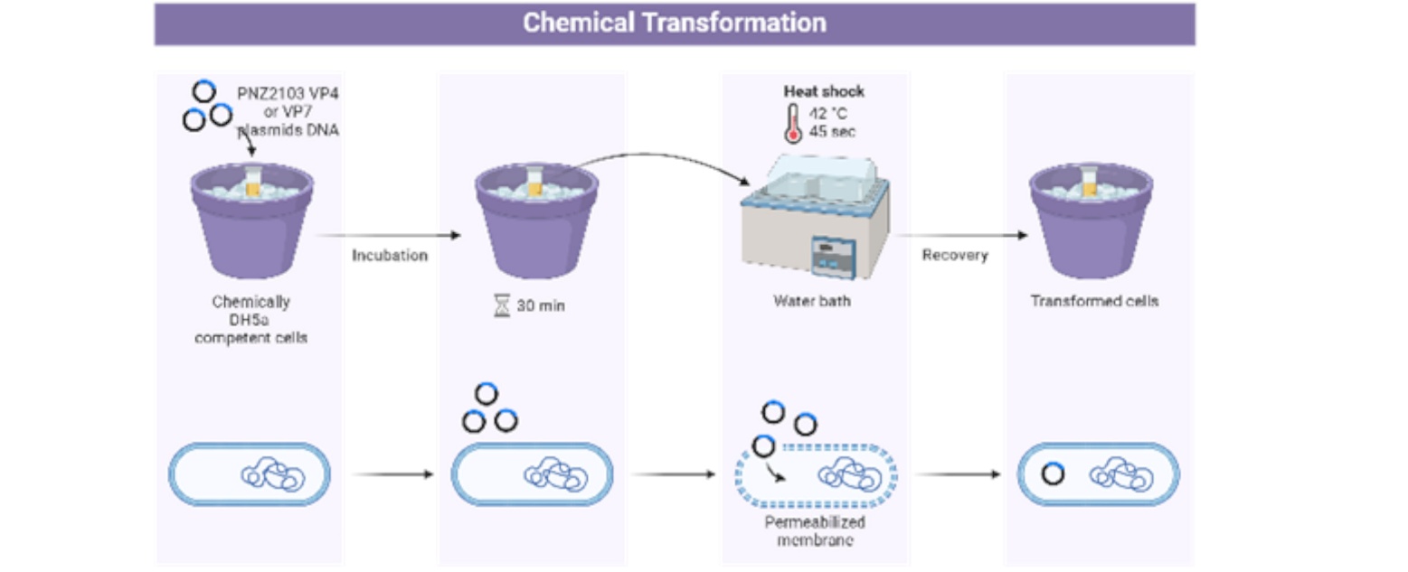 Figure. 2. Transformation of PNZ2103-VP4 and PNZ2103-VP7 Plasmids to DH5α Competent Cells. (via Biorender).