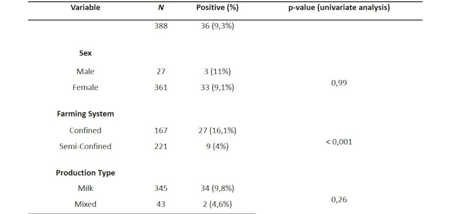 Among females, the seropositivity rate was 9.14% (33/361), whereas in males it was 11.11% (3/27). Regarding the farming system, seropositive animals were found in 16.1% (27/167) of confined goats and 4% (9/221) of semi-confined goats (Table II). Concerning the production purpose, the prevalence was 9.8% (34/345) among goats raised for milk production, and 4.6% (2/43) among those raised for mixed purposes (meat and milk).