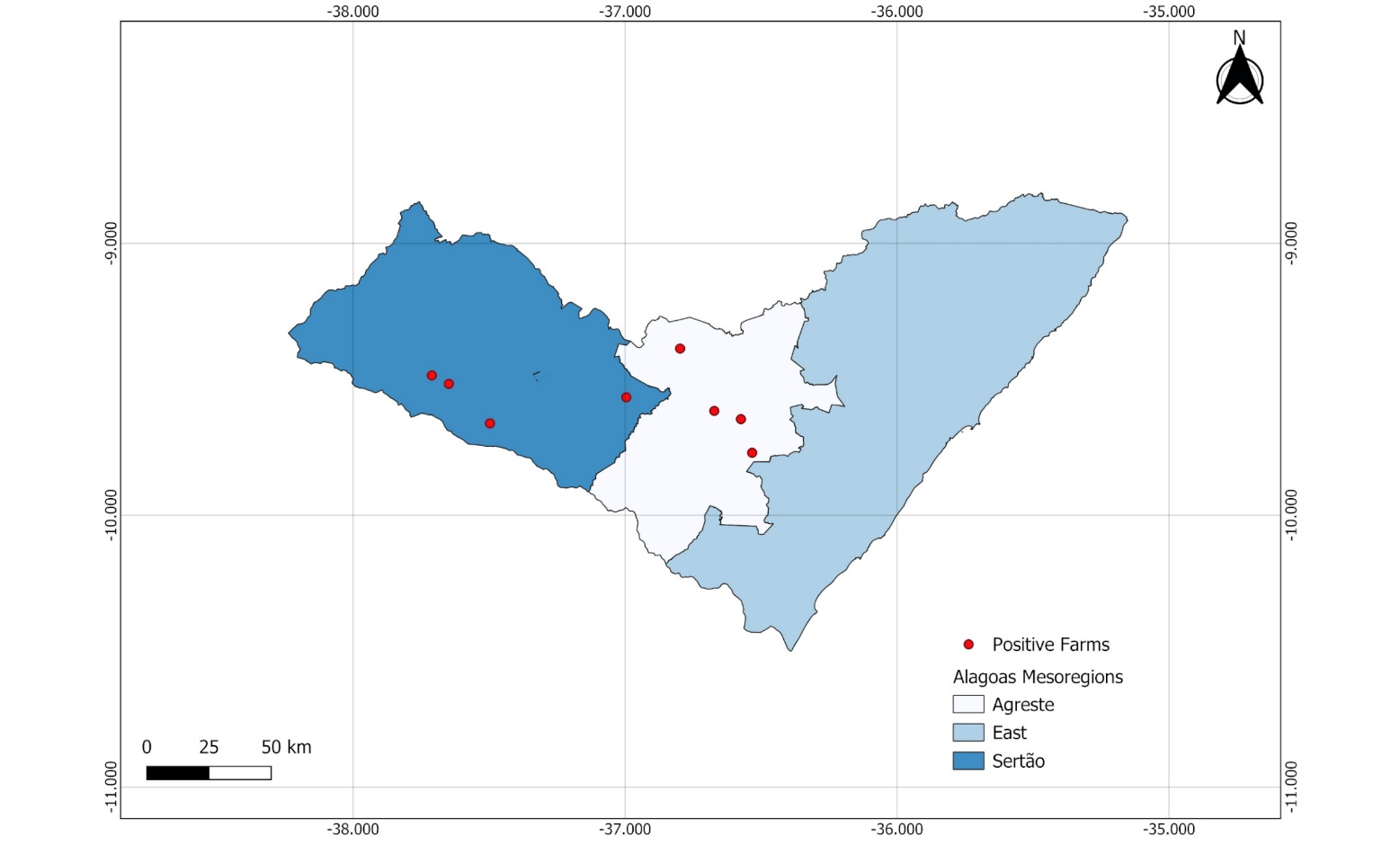 This research was approved by the Animal Use Ethics Committee of the Federal University of Alagoas (approval number: 04/2022). The minimum sample size was determined using the formula for simple random sampling, based on the following parameters: an expected prevalence of 50% (to maximize sample size), a 95% confidence level (z = 1.96), and a 5% margin of error. This resulted in a minimum required sample of 384 goats (Thrusfield, 2007). The locations and registrations of each property were obtained through local cooperatives. Seventeen farms located in eleven municipalities in the semi-arid region of Alagoas—Palmeira dos Índios, Estrela de Alagoas, Coité do Nóia, Arapiraca, Igaci, Limoeiro de Anadia, Major Isidoro, São José da Tapera, Piranhas, Pão de Açúcar, and Maravilha—were visited. The study included goats older than six months, regardless of sex or breed, raised on family farms where the owners consented to participate. Blood samples were collected exclusively from these animals. All goats present on each selected property were sampled. The collection occurred from September 2023 to August 2024. Blood was drawn from each goat, and after clotting, the resulting serum was transferred to microtubes and stored at −20 °C until serological testing.