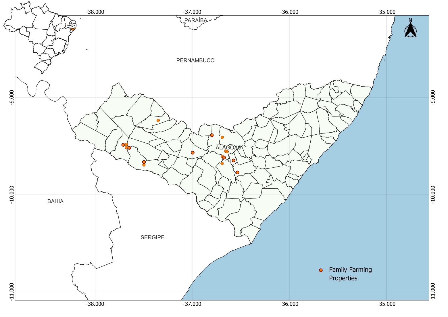 The state of Alagoas is located in the Northeast region of Brazil (Figure 1), covering an area of 27,830.661 km², with a population of 3,127,683 inhabitants and a Human Development Index (HDI) of 0.684 (IBGE, 2024). It lies between latitudes 8°48'12" and 10°29'12" South (S), and longitudes 35°09'36" and 38°13'54" West (W). It is bordered to the north and west by the state of Pernambuco, to the south by the states of Sergipe and Bahia, and to the east by the Atlantic Ocean (Souza et al., 2020). The goat population in Alagoas is estimated at 64,482 animals (IBGE, 2023). The state is divided into three mesoregions: Agreste, East, and Sertão. The semi-arid climate predominates in the Agreste and Sertão regions. For this study, a family farm was defined as one that: a) predominantly employs family labor; b) derives the majority of household income from livestock farming; and c) is managed by the family. These properties have limited infrastructure, are operated by low-income families utilizing low-tech production systems, and typically exhibit modest productivity (Buainain et al., 2004; Brasil, 2006).