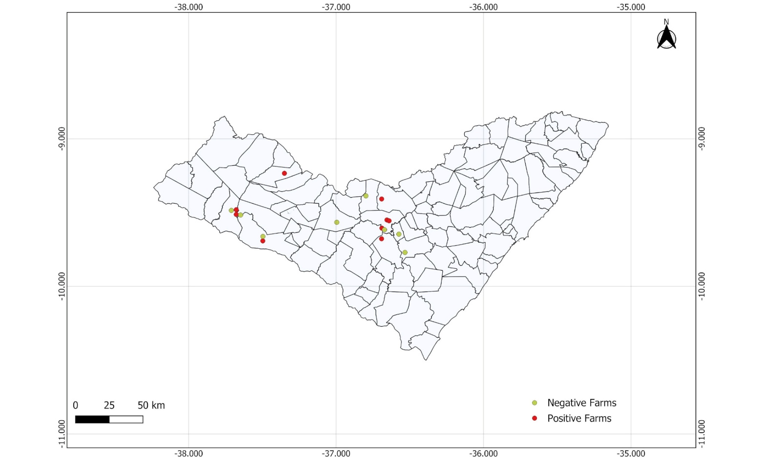 Figure. 2. Distribution of Family Farming Properties with Positive or Negative Small Ruminant Lentivirus (SRLV) Cases in Caprines in the Semi-Arid Region of Alagoas, Brazil.