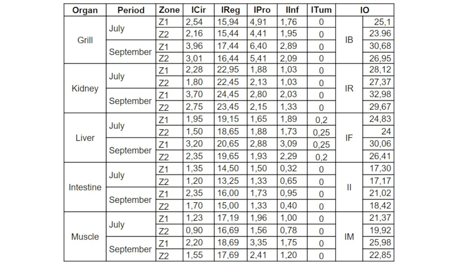 Kidneys were the most affected organs, with higher average IOK (kidney index) scores in September, Z1 (32.98) > Z2 (29.67), expressing a significant difference (P = 0.0104). In July, values were lower, with Z1 (28.12) > Z2 (27.37) showing no significant difference (P = 0.42). Comparing the two periods, there was a very significant difference in Z1 (P = 0.0057) compared with Z2 (P = 0.163, no significant difference). As for lesions, regressive alterations were clearly dominant, with very high indices when compared with circulatory and inflammatory scores. Proliferative lesions, although rare, were more visible in September in both zones (Figure 3-B).