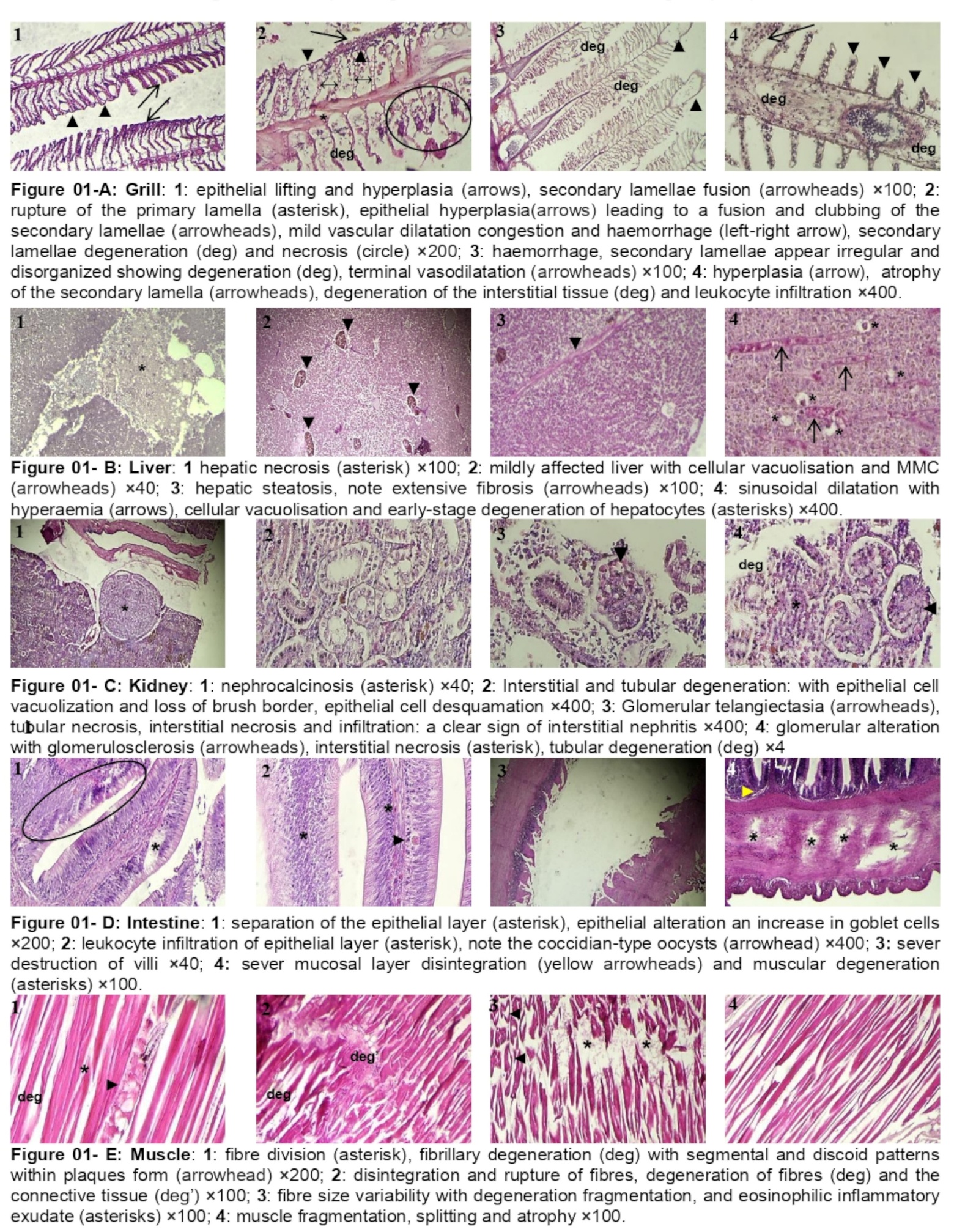 Liver, the central organ of detoxification, is very sensitive to pollutants. The regressive lesions observed, such as vacuolisation, hydropic degeneration, necrosis, pyknotic nucleus, and karyolysis, were also reported in fish exposed to heavy metals (notably: Cu, Cd, Pb, Ni) 4. Furthermore, there was a significant increase in melanomacrophage centres (MMC) in the examined sections. This lesion may be linked to industrial and agricultural activities that contribute to the accumulation of copper and chromium according to Thabet et al. (2019), and as reported in several species of carp (Khan et al., 2024). The severity of these lesions is often correlated with the concentration of pollutants and environmental parameters, particularly pH (Paul et al., 2014). Nevertheless, we have reported certain stability for this parameter. All of these lesions were also linked to nitrates as observed in the African catfish Clariasgariepinus (Abdel-Warith et al., 2020) and to ammonia as in the Nile tilapia (Oreochromis niloticus) (Motamedi-Tehrani et al., 2025). However, there is some discrepancy between these observations and our results. Meanwhile, the combined effect of ammonia and nitrite has been linked to haemorrhage, necrosis and liver vacuolisation in Gangetic MystusandMystuscavasius by Karim et al. (2022). In addition, nitrates can interact with other pollutants, such as heavy metals, and exacerbate their toxicity. For example, co-exposure to nitrates and cadmium led to hepatic vacuolar degeneration and sinusoid dilatation in Japanese flounder (Paralichthysolivaceus) (Yu et al., 2025). These findings reinforced our own observations. Similarly, phosphates and sulphates, although the latter were non-hypoxic in our study, can induce liver lesions but through other mechanisms (Venkataraman et al., 2007) as they can interact with other pollutants, such as heavy metals, thereby increasing their toxicity (Hamad et al., 2024). Nevertheless, pesticides are also involved in hepatic degeneration (Shahid et al., 2021). As for the circulatory lesions, they included dilation and congestion of the sinusoids and haemorrhages. These lesions may be due to the accumulation of heavy metals (Thabet et al., 2019; Mahboob et al., 2020) or, at a lesser extent according to our results, to nitrates known to cause such lesions (Abdel-Warith et al., 2020). Overall, polluted waters have often led to inflammatory lesions in the liver (Ogundiran and Fawole, 2021). In fact, heavy metals can cause the infiltration of inflammatory cells into the hepatic parenchyma (Mahboob et al., 2020) and the formation of MMC (Viana et al., 2021). These lesions were very widespread on the examined slides. While leukocyte infiltration in the portal tissues, which is often linked to nitrites (Abdel-Warith et al., 2020), was less frequently observed. Inflammatory and proliferative lesions, particularly hypertrophy and an increase in the number of Kupffer cells, were generally reported in fish exposed to suspended matter (Thabet et al., 2019) and heavy metals (Mahboob et al., 2020), which aligned with our observations; although to a lesser extent according to our results, organic matter recognized for inducing such lesions (Thabet et al., 2019) or nitrates (Abdel-Warith et al., 2020) can also cause such alterations. In conclusion, despite the histopathological alterations in fish livers caused by pollutants being well documented, It is crucial to take into account the role of bioremediation and other mitigation strategies, such as the use of microorganisms to reduce toxic contaminants, which have proven promising for improving water quality and reducing the impact of pollutants on aquatic life (Khan et al., 2024).